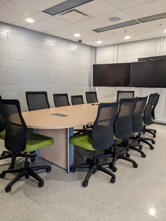 Salle munie d’écrans géants, grand tableau blanc, caméras et contrôle à distance via le logiciel de gestion vidéo Milestone.